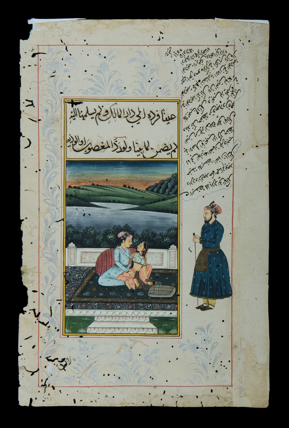 2 Mughal Illuminated Book Pages. Depicting courting couples in pavilions. Each with a figure observing from the margins. Nasta'liq inscriptions to margins Gouache, Ink & Gilt (2) 28x18cm, & 26x14cm Estimate $300-500