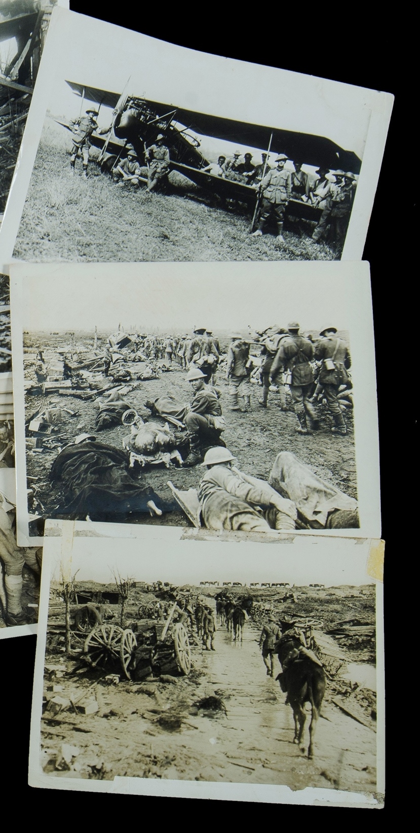 9 WW1 Australian Official Photographs, from the Western Front. Wounded on Menin Road 20th September,1917; Captured German Aeroplane; Dressing Station Menin Road in Ypres; Australians looking at the destroyed bridge at Baupame; Two Men from the 2 Pioneers; Idiot Corner, Ypres 9th Battalion; Lord Northcliffe visiting Aust after Pozieres; No description; & The Australian 5th Brigade Band plays on the march as AIF Troops triumphantly enter Bapaume on March 19th,1917. 15x20.5cm each (approx). Estimate $100-200