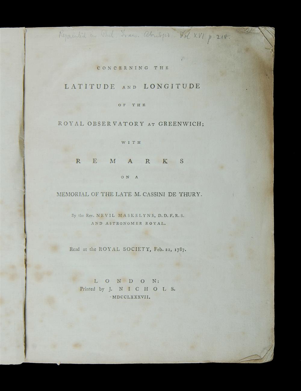BOOK, 'Concerning the Latitude & Longitude of the Royal Observatory at Greenwich,' Nevil Maskelyne. With remarks on a Memorial of the Late M Cassini DeThury. London: Printed by J Nichols, 1787. 39 pages, with original marbled endpapers. Losses & bumping to corners, foxing to preliminaries, interior mostly clean & bright. Binding good, latter tape to spine. Modern protective boards with pockets. 27x21cm. Estimate $800-1,200