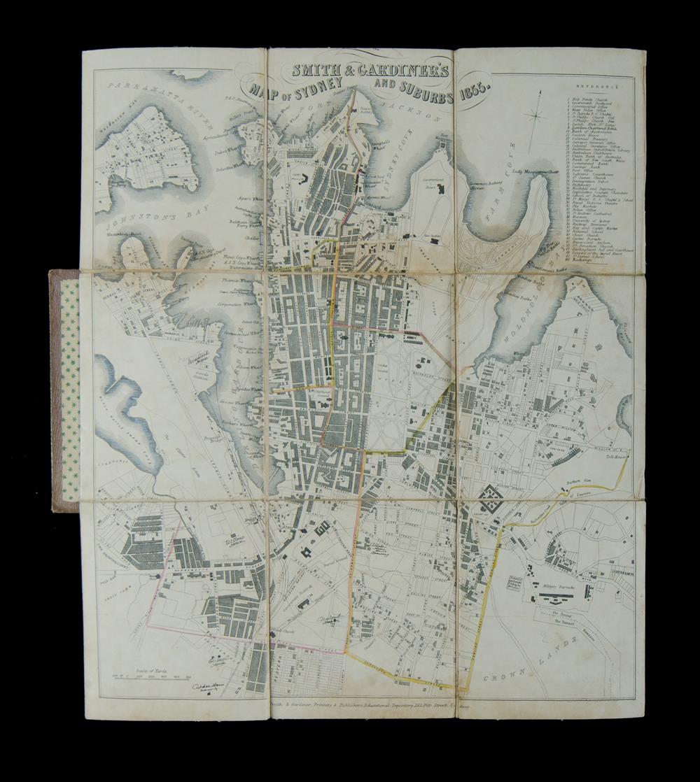 Smith & Gardiner's Map of Sydney & Suburbs 1855. Leather bound cover (11.5x14cm), inside folds out to a 32.5x38.5cm map on material. Enclosed by a protective cardboard folder to fit. Estimate $80-150