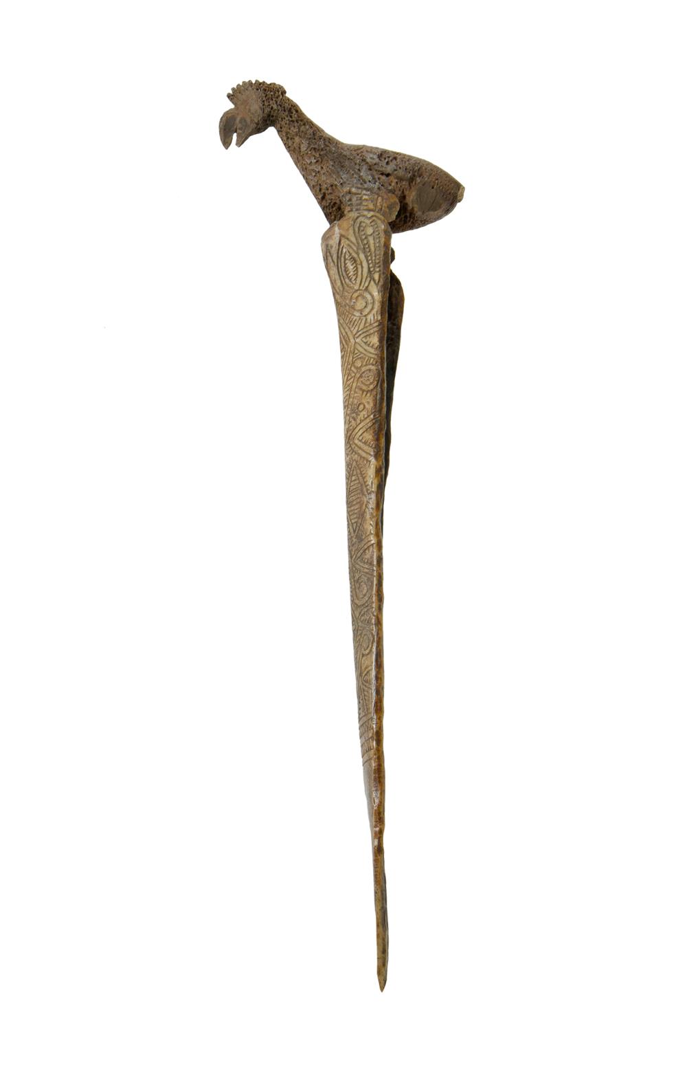 5 Various Bone Daggers. One, cassowary bone dagger, Sepik River region of Papua New Guinea Highlands, collected prior to World War II (35cm). Two, engraved (30cm & 34cm) and, two carved & engraved (39cm), good patina, early 20th C, Sepik River, Papua New Guinea, Dr P Elliot collection (1965) with bird finials (L39cm). Collection Dr John Raven, Perth. Estimate $300-600