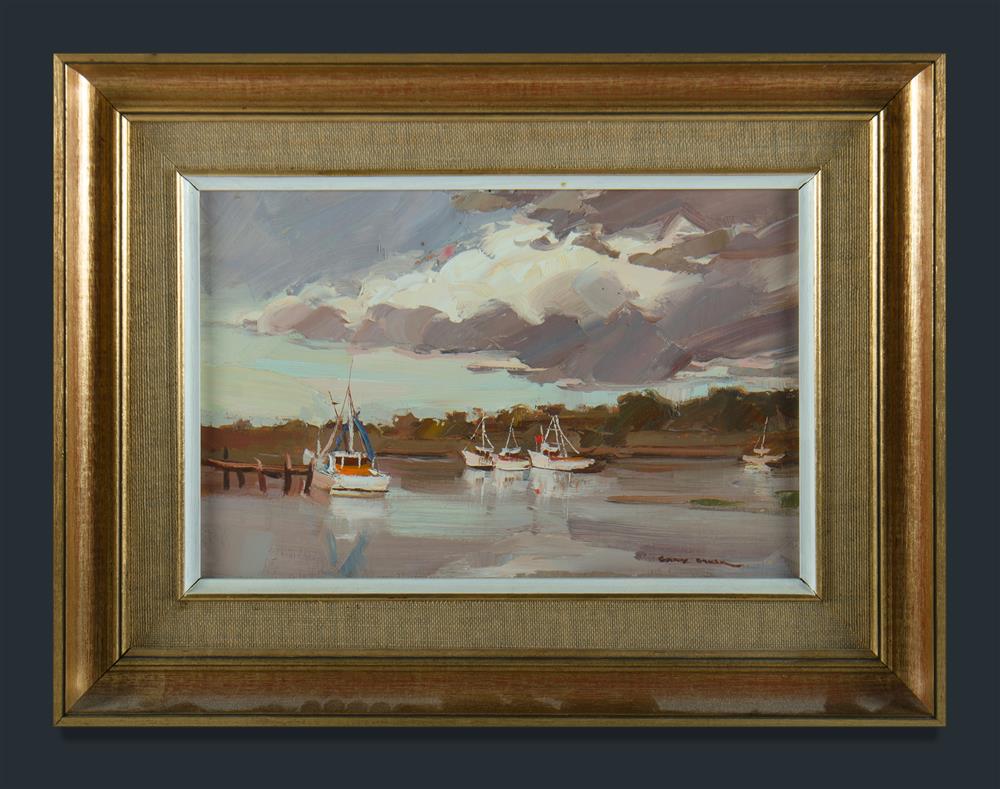 BAKER, Gary (b.1954) 'Boats in the Bay,' Sandgate Brisbane' Oil on Ply 19x29.5cm Estimate $50-100