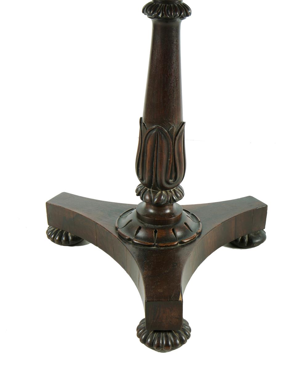 19th C Rosewood Veneer Based Side Table. Trefoil base, bun feet, acanthus column. Replacement top. H51cm W55cm Estimate $50-100