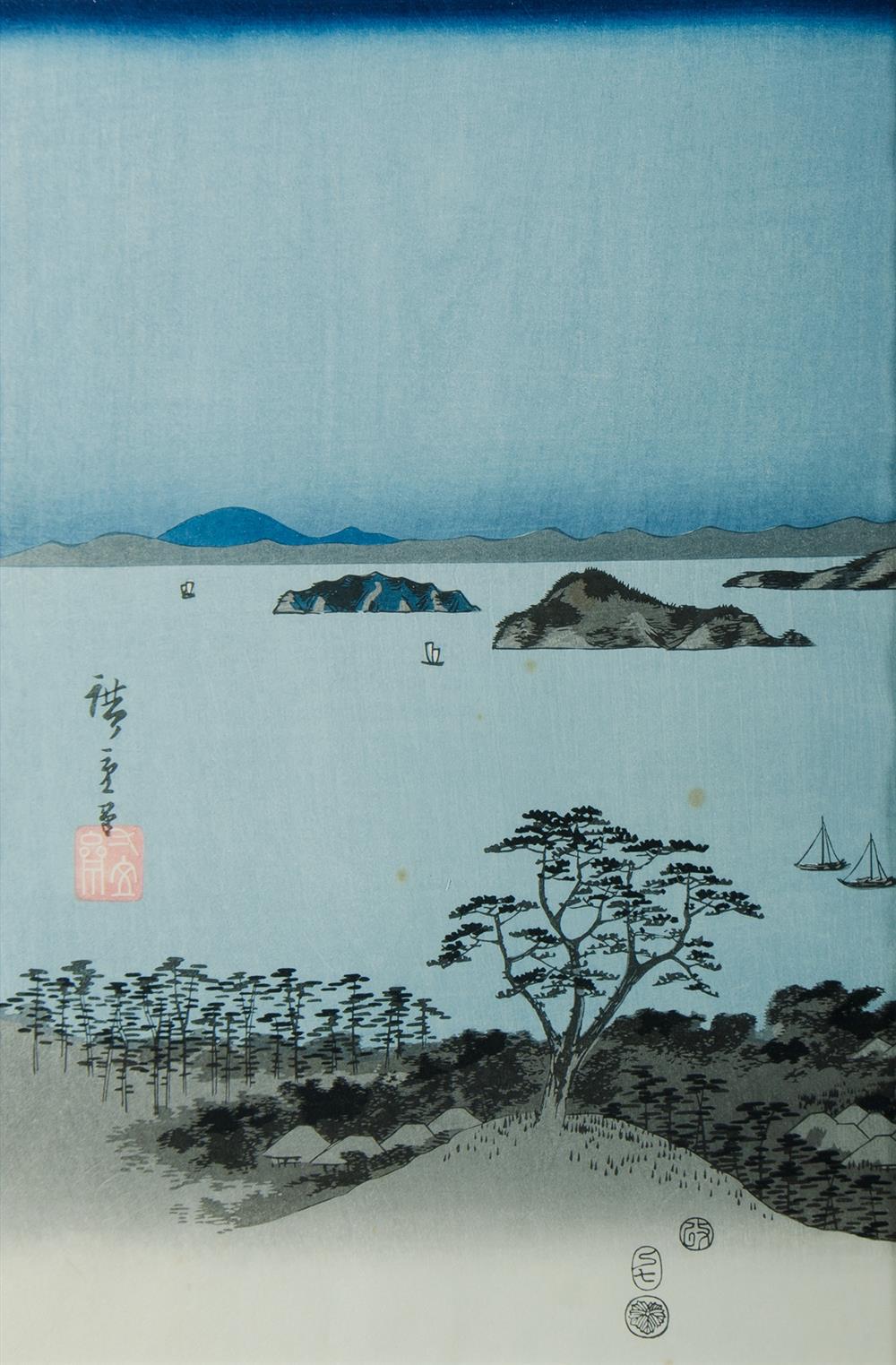 HIROSHIGE, Harbour Scene at Night Triptych Woodblock 37.5x24.5cm (each sheet) Estimate $100-200