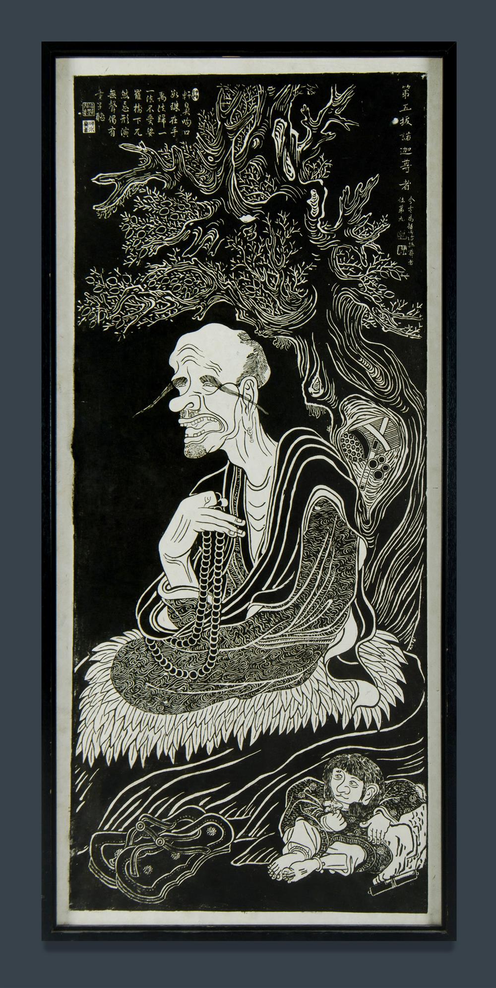 After GUANXIU, (Chinese 832-912) 'Nakula, the 5th Arhat,' from the 16 Luohans. Date of this impression unknown. Woodcut 114x48cm Estimate $50-100