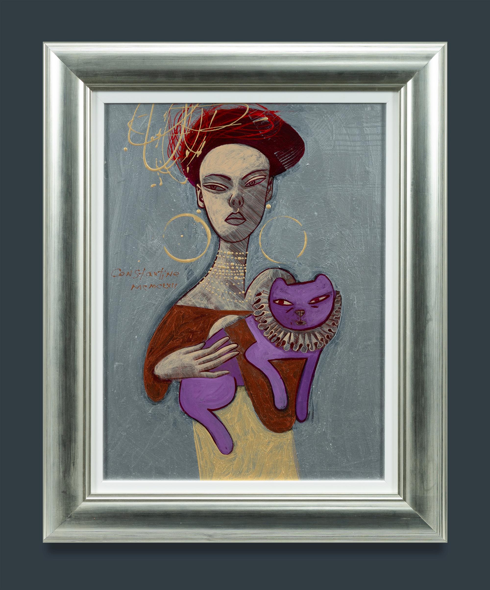 POPOV, Constantine (Swiss/Australian b.1962) Woman with Purple Cat (Silver Background), 2022. Profusely inscribed verso. Acrylic on Board 40x30cmEstimate $350-550