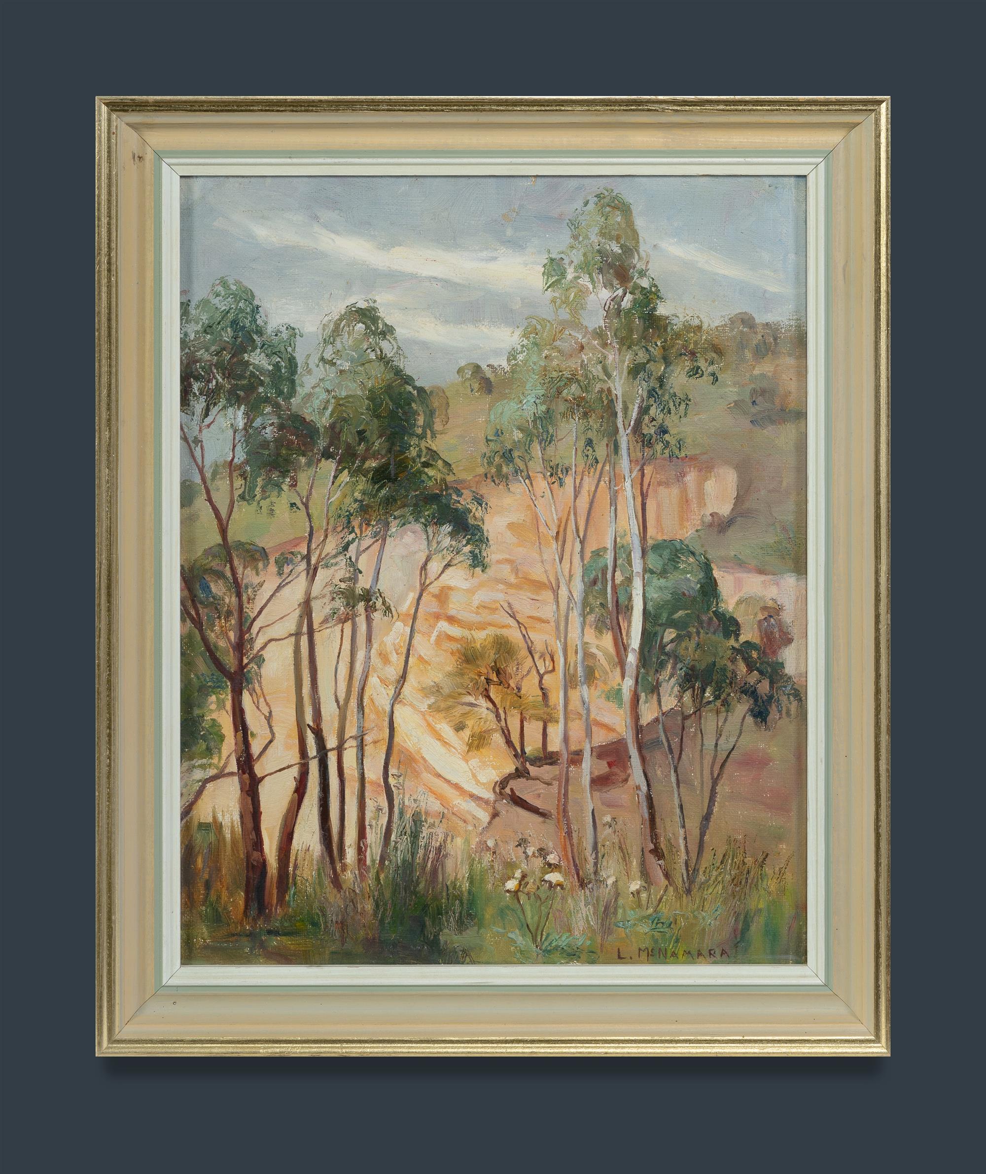 McNAMARA, Leila Constance (1894-1973) Sandstone Hillside with Gums Signed lower right. Oil on Canvas on Board 37x29cm PROVENANCE: Estate of Mary Beatrice Hoyle, niece of the artist.Estimate $150-300