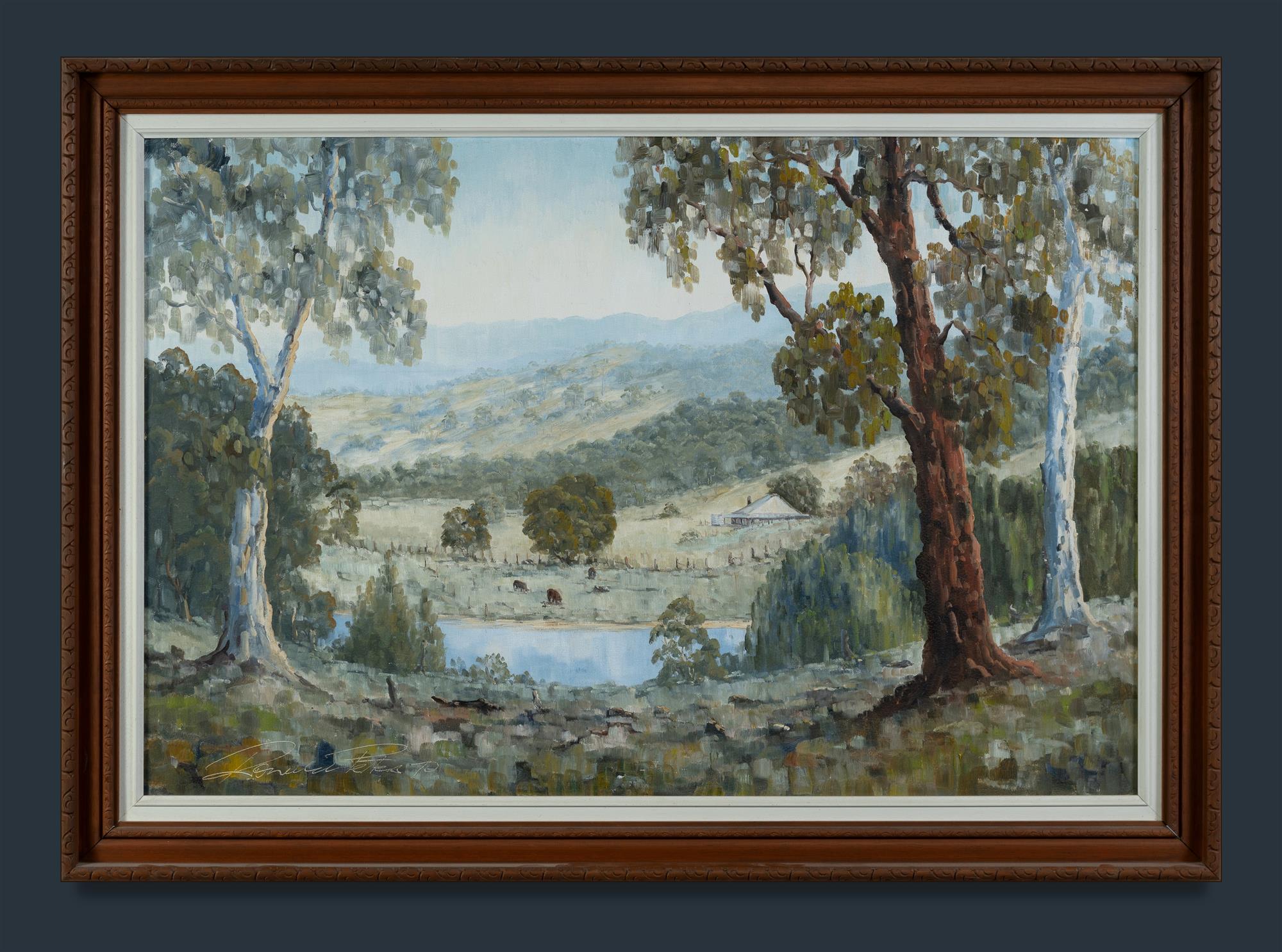 PETERS, Ronald Rural Property, with Cattle Grazing by a Reservoir, 1970. Oil on Canvas on Board 60x90cmEstimate $100-300