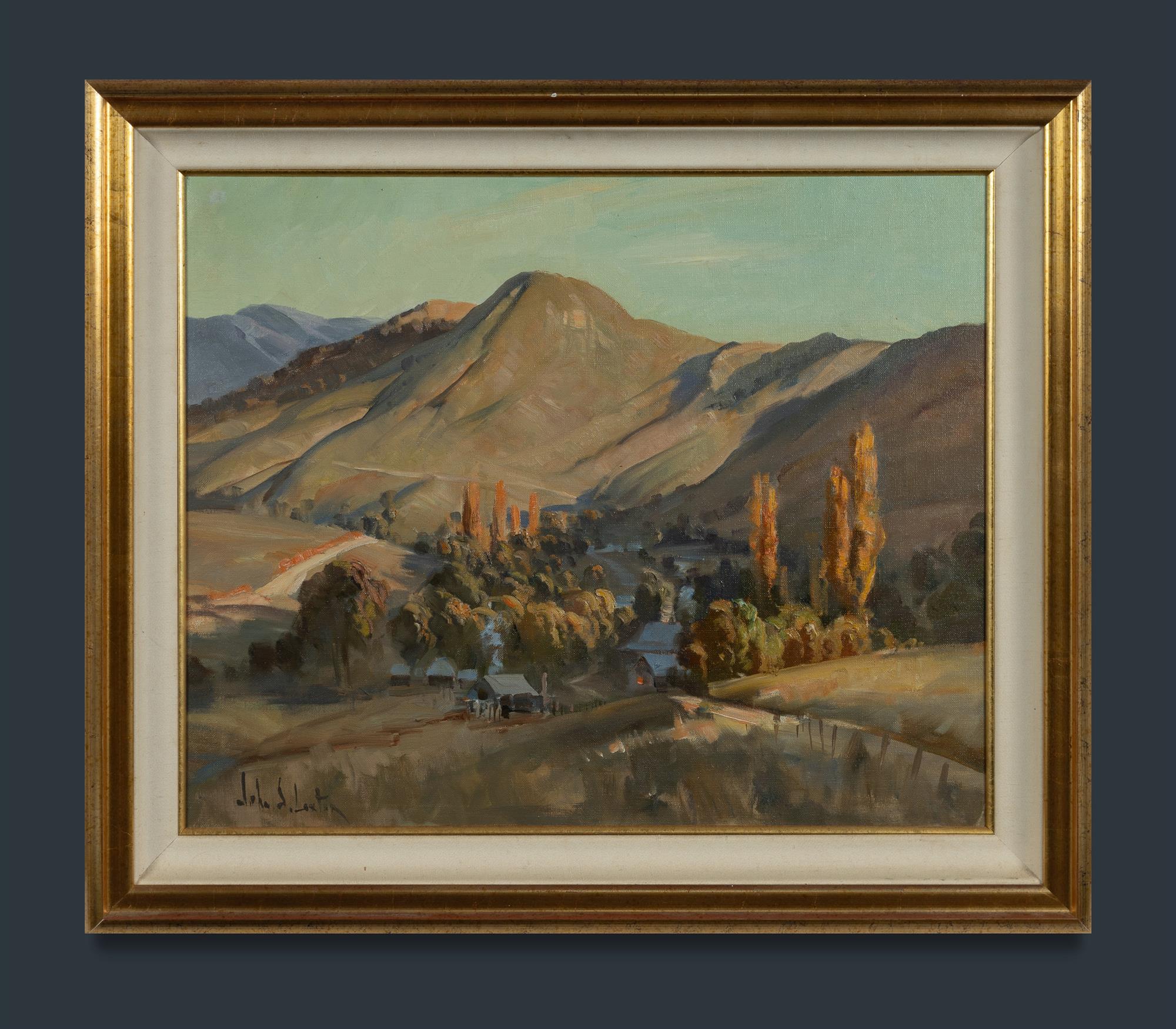 LOXTON, John S (1903-1969) Afternoon Light, Farm in a River Valley. Oil on Canvas on Board 53.5x66cmEstimate $400-600