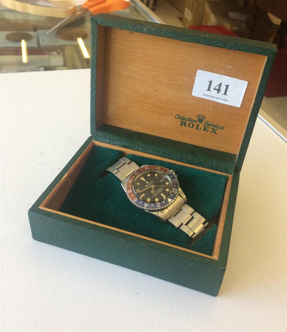 Rolex Oyster Perpetual GMT-Master Superlative Chronometer. Officially certified 7th September 1965, Oyster Perpetual, GMT-Master, Superlative Chronometer in a Rolex leather and wood box. Running, but unserviced. Crown/winder needs attention Estimate $1,200-1,600