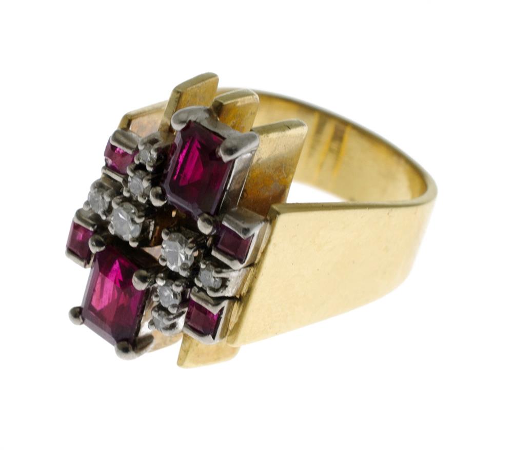 Retro Ring with Diamonds & Rubies. Set in platinum 18ct yellow gold band, small diamonds 0.11ct, size I. W11.9g (total) Estimate $700-1,200