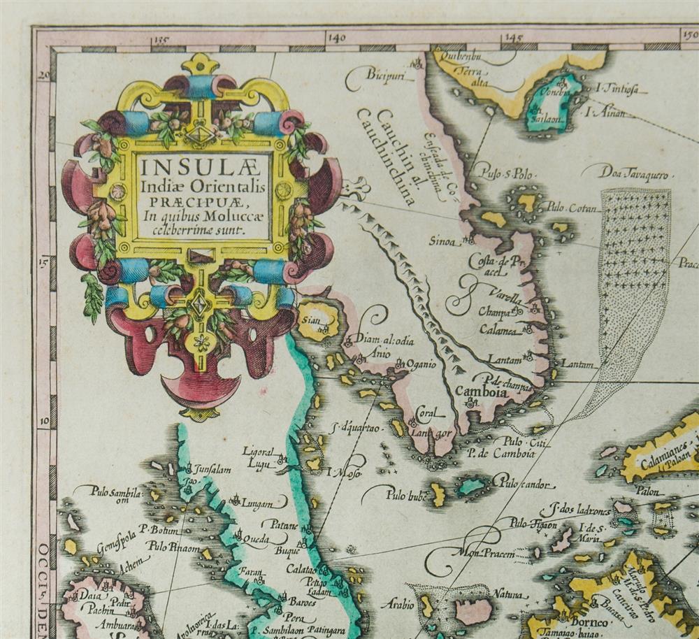 Framed decorative colour map of the East Indies showing a portion of New Guinea. Insulae Indicae Orientalis Precipual. Image (40x 53cm) Frame (57x68cm) Estimate $500-800