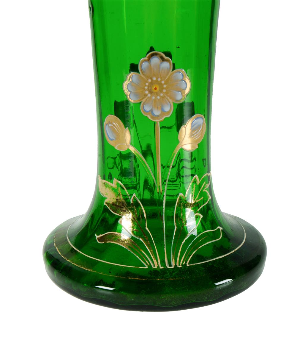 Bohemian Green Glass Trumpet Vase. With gilt & white enamel decoration of swags & flowers. H41cm Estimate $70-140