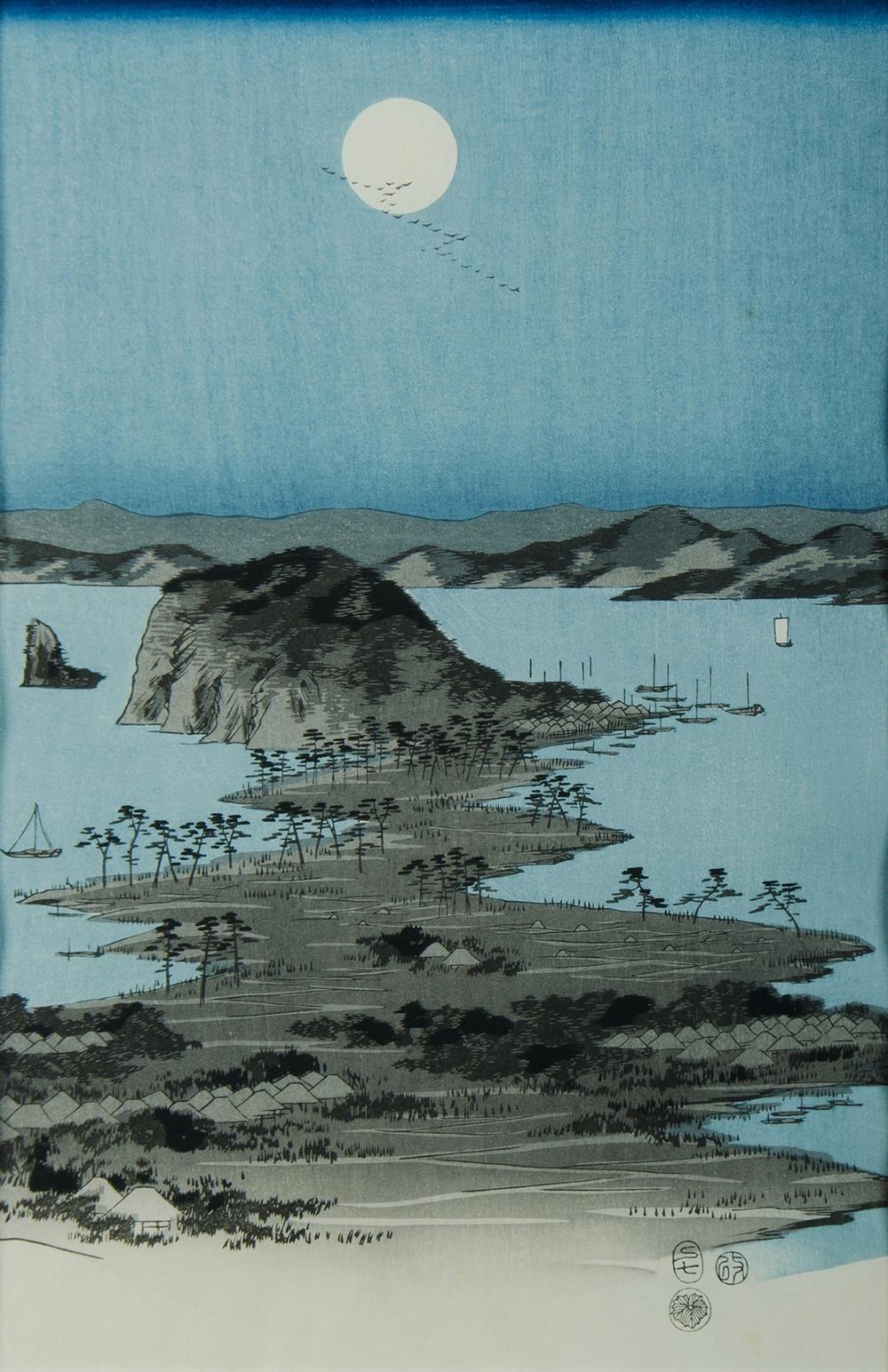 HIROSHIGE, Harbour Scene at Night Triptych Woodblock 37.5x24.5cm (each sheet) Estimate $100-200