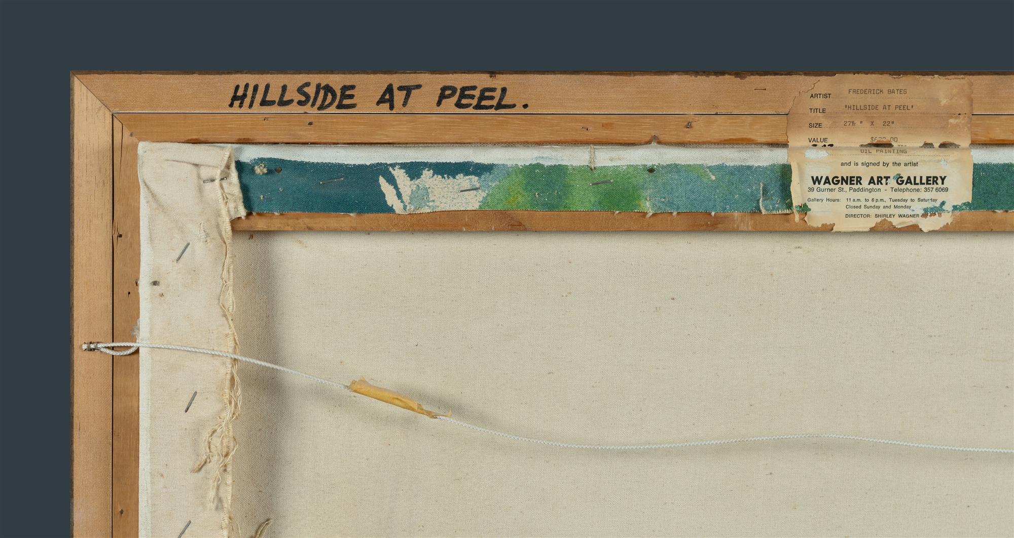 BATES, Frederic (1918-2009) 'Hillside at Peel' Signed lower left. Wagner Art Gallery, Sydney, label verso. Oil on Canvas 58.5x71.5cmEstimate $300-500