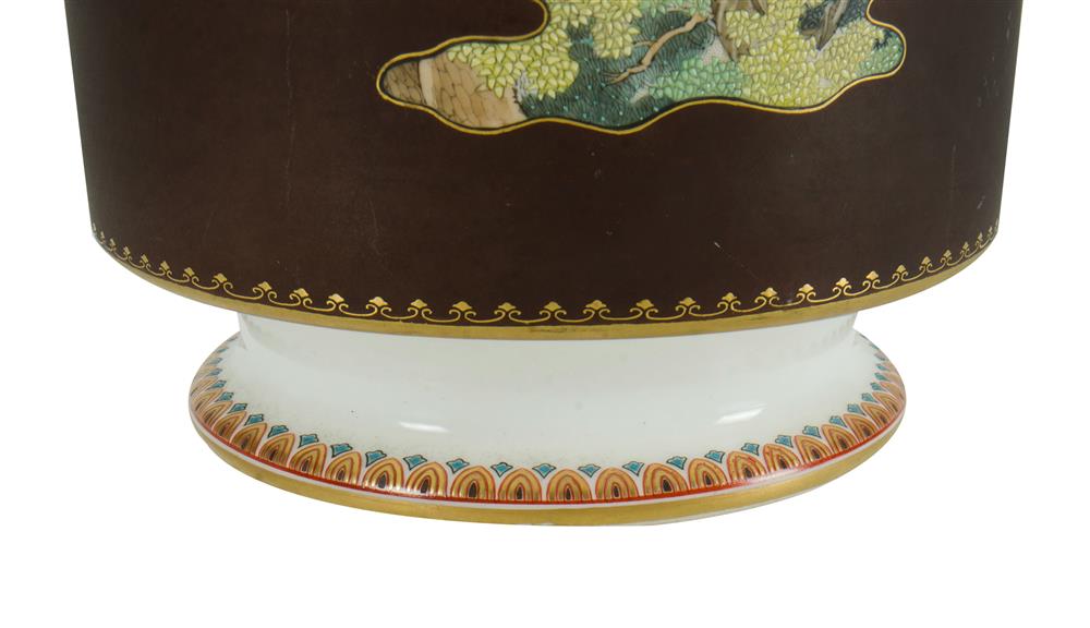 Japanese Satsuma Pottery Vase. Cylindrical vase with very fine painted continuous landscape. Impressed mark to base. H30cm Estimate $300-500