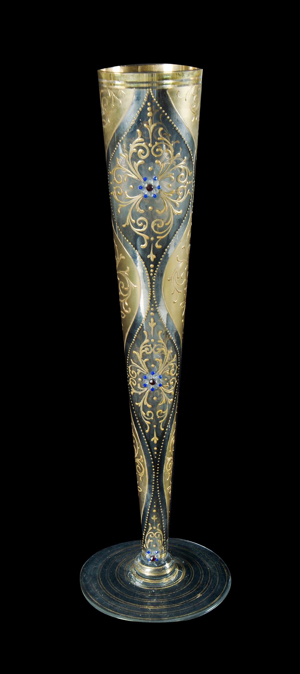 Bohemian Glass Trumpet Vase. With gilt & jewelled decoration. Together with a pair of bohemian gilt & enamel beakers. H35cm (vase) Estimate $50-100