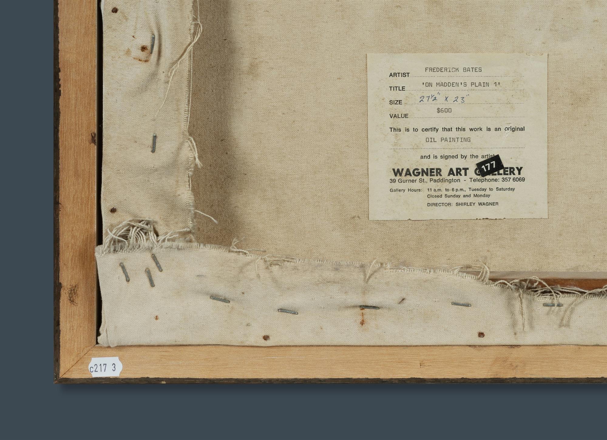 BATES, Frederic (1918-2009) 'On Madden's Plain 1' Signed lower left. Wagner Art Gallery, Sydney, label verso. Oil on Canvas 58x71cmEstimate $300-500