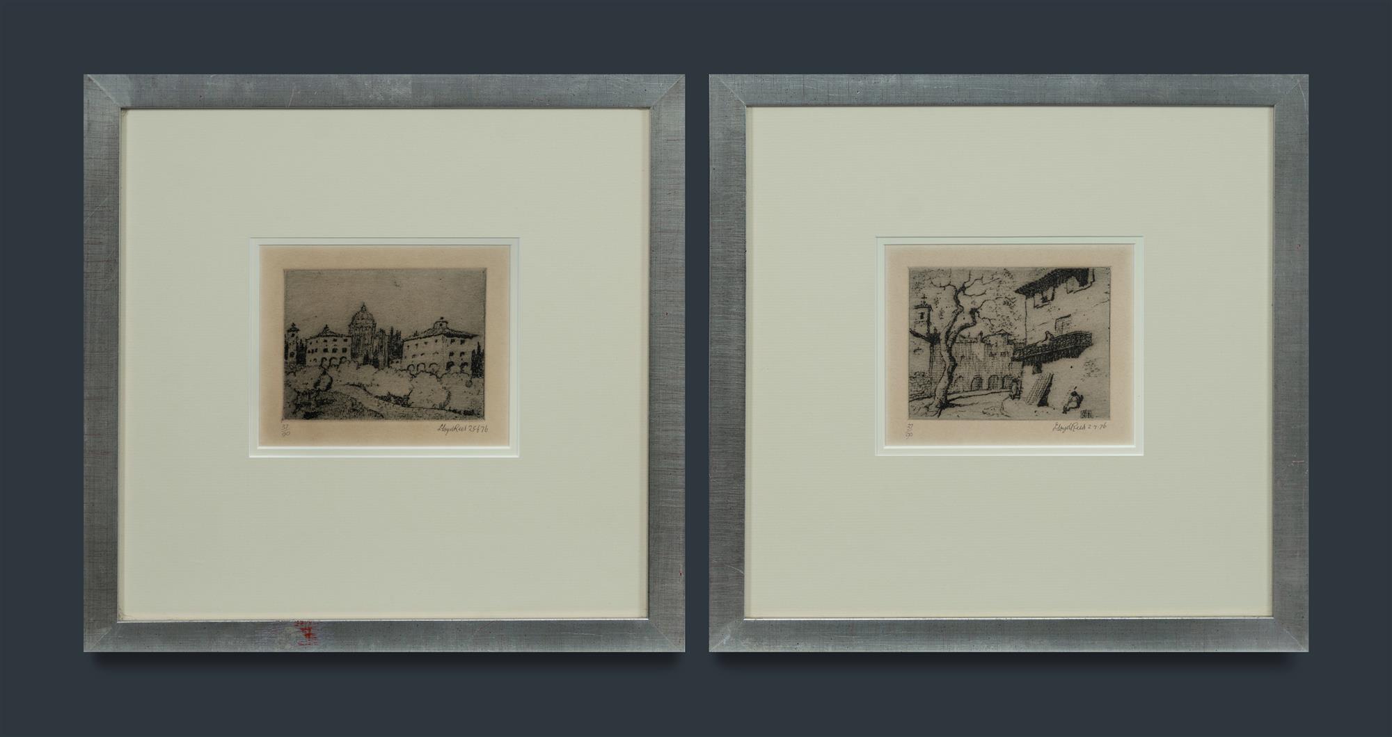 REES, Lloyd (1895-1988) (4) 'Plaza Soller, Majorca', 'Tuscan Town', 'Farm House, Majorca,' and 'Spanish Village,' 1976 (all from 'Memories of Europe') Etching 37/90 (4), 10x13cm (plate)Estimate $400-700