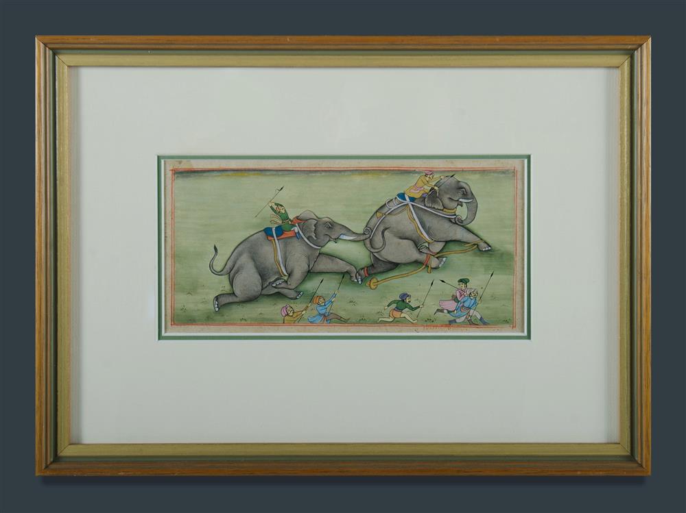 4 Indo-Persian School Works. Three manuscript pages depicting hunting subjects etc; also 1 other smaller (9x20cm) showing charging elephants. smaller (9x20cm) showing charging elephants. Ink & Gouache (4) 27x15cm (largest) Estimate $100-200