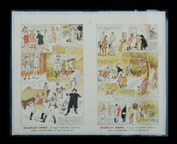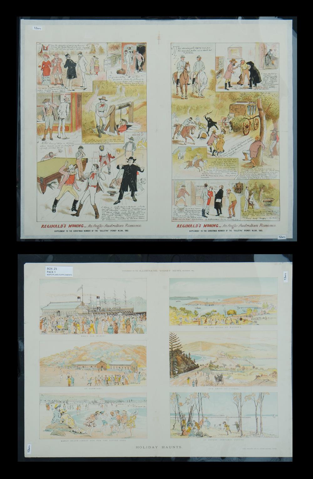 Reginal's Wooing - An Anglo - Australian Romance. Signed Hop in one panel (Livingston Hopkins). Supplement to The Christmas Number of The 'Bulletin,' Sydney, NSW, 1883. An early Australian comic (45x57cm). Enclosed in Mylar. Incl. Holiday Haunts. Who's for Manly? At Clontarf, Manly Beach. On The Rocks at Watson's. Our Drive To Coogee. At Botany - Historic ground. Supplement to The Illustrated Sydney News, December, 1883. Gibbs, Shallard, And Co. Chromo Printers, Sydney (41x57cm). Enclosed in Mylar. Estimate $80-120