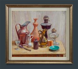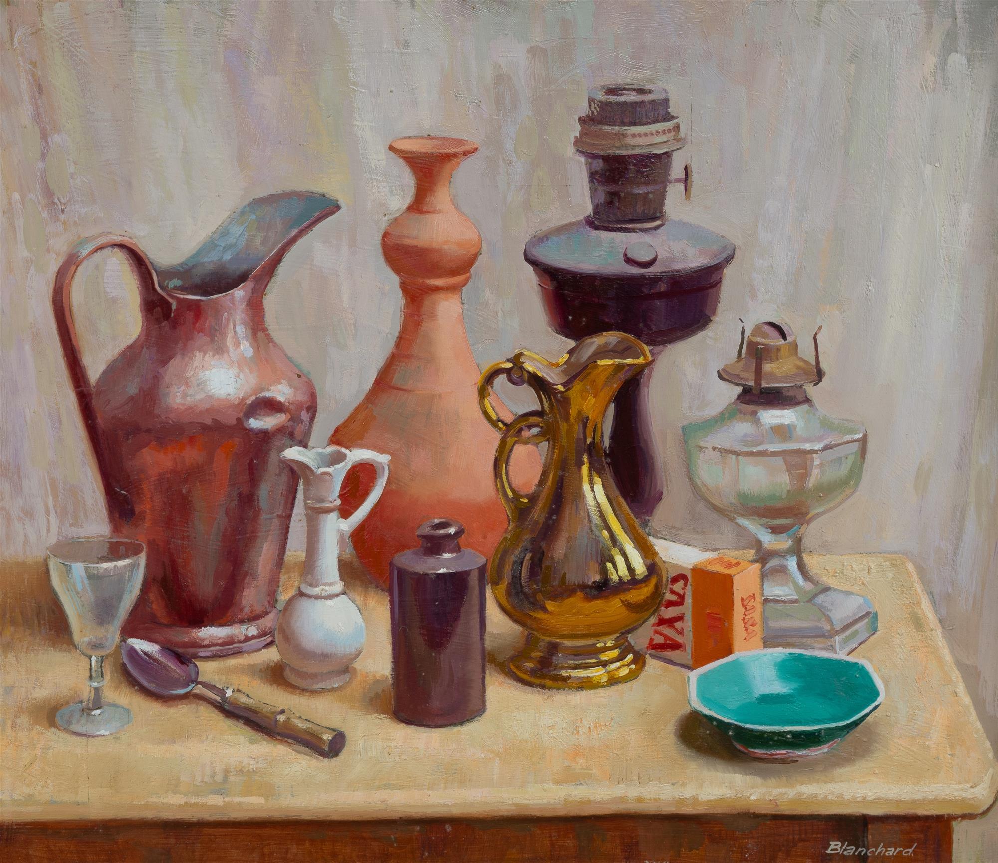 BLANCHARD, Brian (1934-2015) 'Jugs and Lamps' Signed lower right; artist label verso. Oil on Board 60x70cm PROVENANCE: Family of the Artist.Estimate $275-450