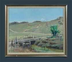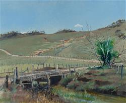 BATES, Frederic (1918-2009) 'Hillside at Peel' Signed lower left. Wagner Art Gallery, Sydney, label verso. Oil on Canvas 58.5x71.5cmEstimate $300-500