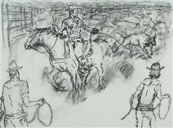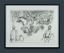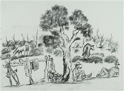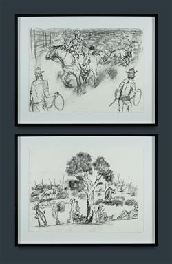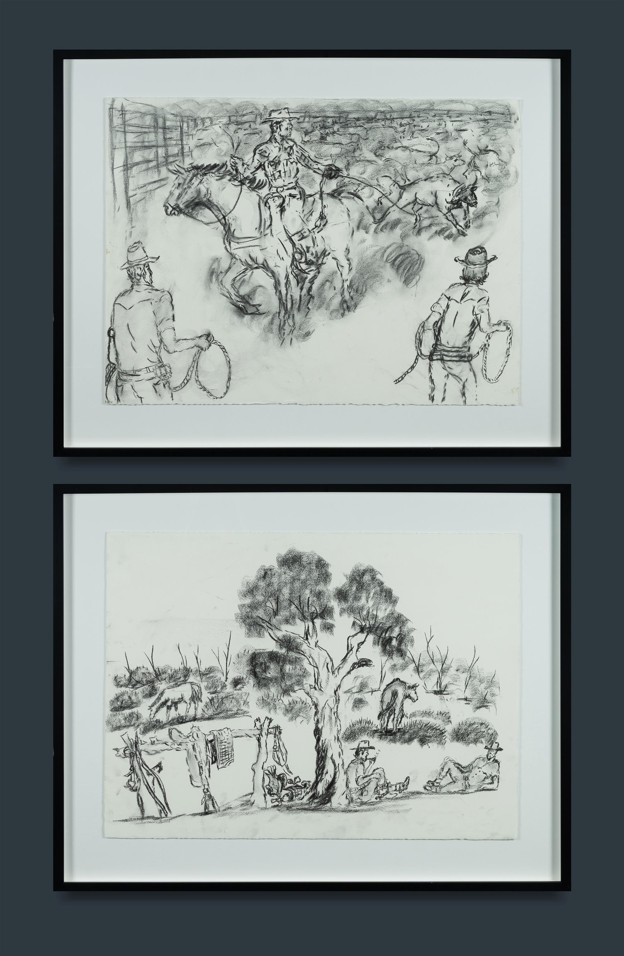 STREET, Mervyn (b.1950) (2) 'Branding Days, Nine Mile Yard'; & 'Having a Break From a Long Ride' Each accompanied by a Mangkaja certificate of authenticity (cat #121/20 & 119/20) Charcoal on Arches Paper (2) 56x76cm (each)