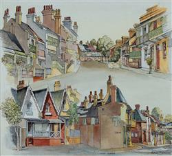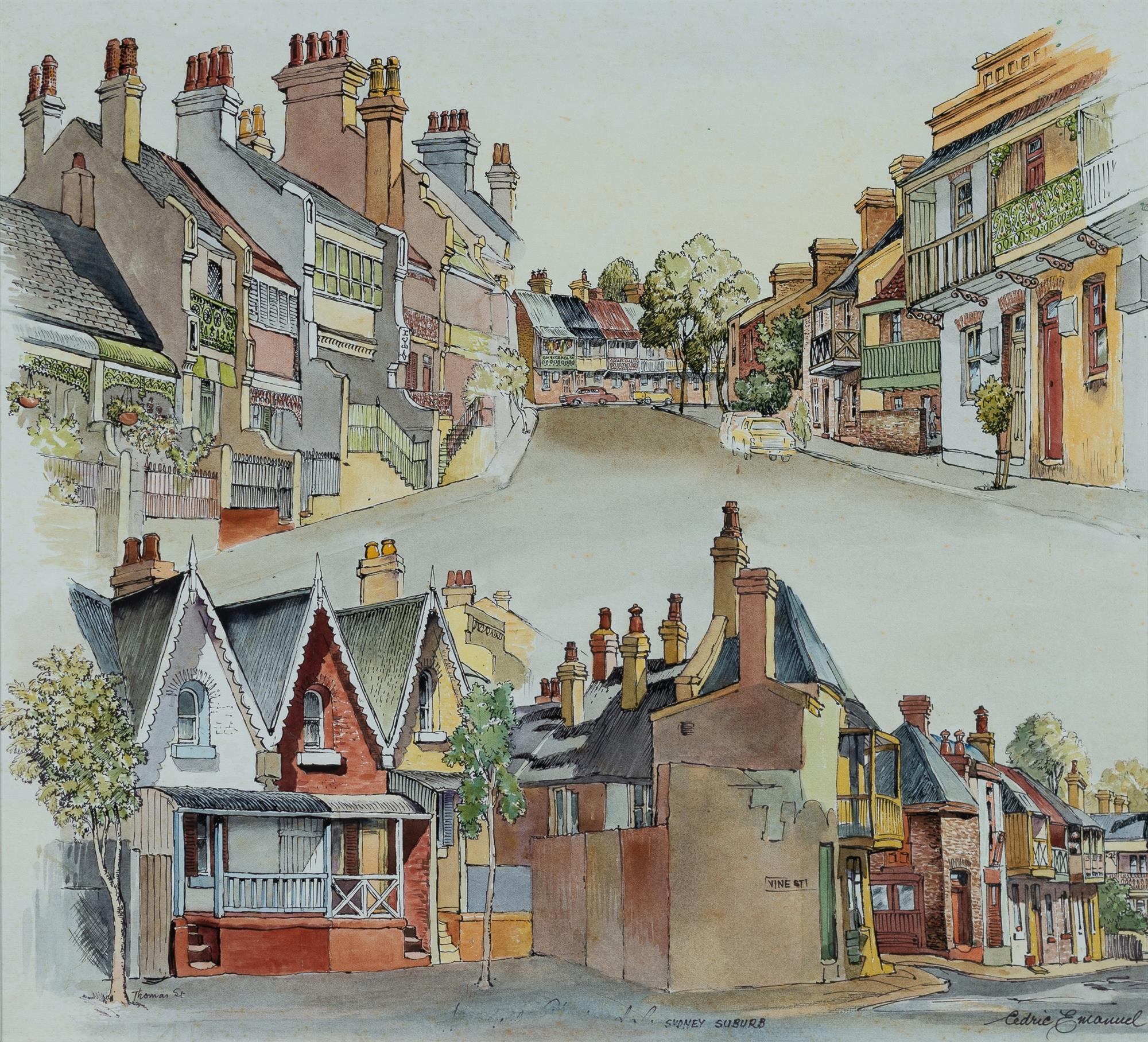 EMANUEL, Cedric (1906-1995) Thomas Street and Vine Street, Darlington, Sydney. Ink & W/Clr 41x45cm