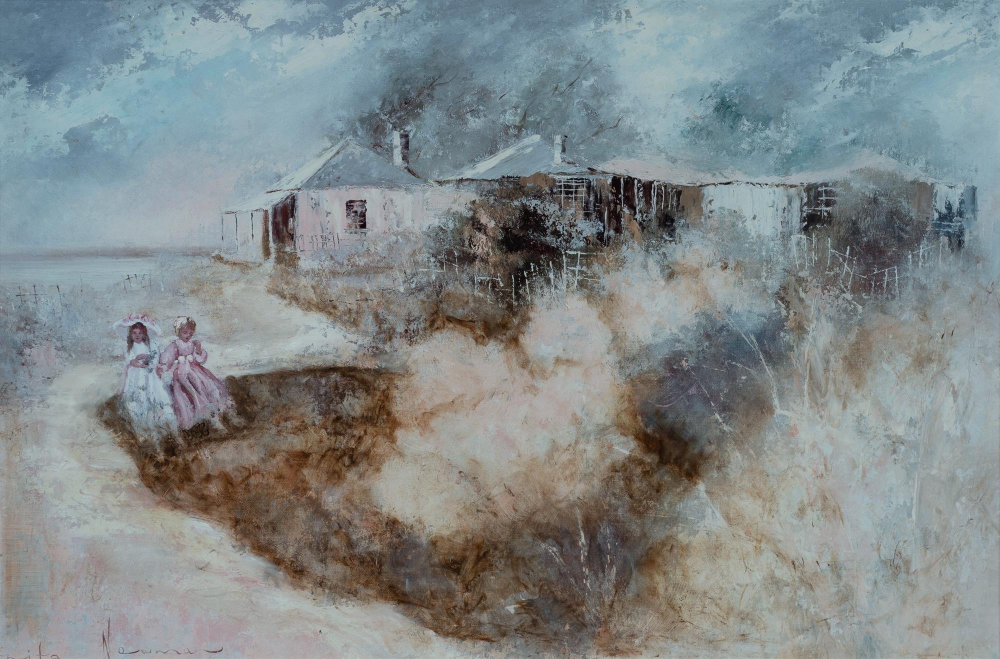NEWMAN, Anita (b. 1946) Best Friends Sitting Outside Country Homestead Oil on Board 52x79cmEstimate $100-200